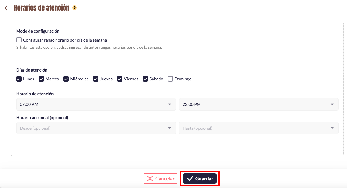 • Si no activás esta sección, tu tienda quedará abierta las 24 horas