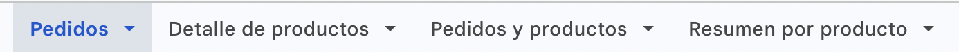 El Excel incluye cuatro solapas que puedes elegir para visualizar: Pedidos, Detalle de productos por pedido, Pedidos y productos unificado, y Resumen de productos.