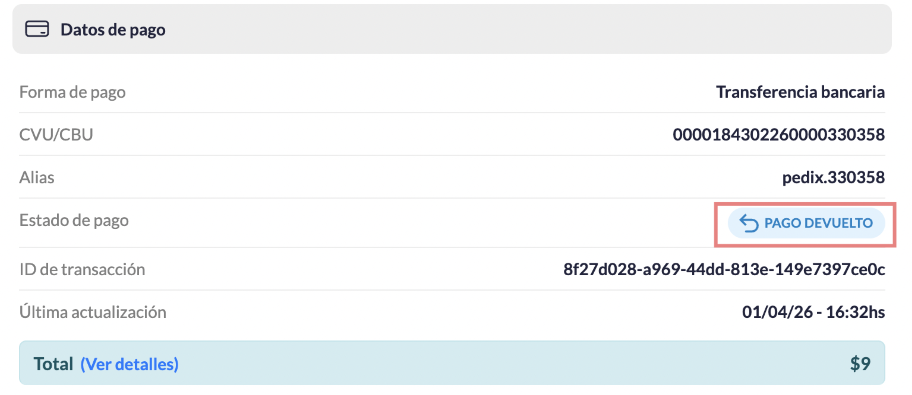 - El pago se devuelve automáticamente