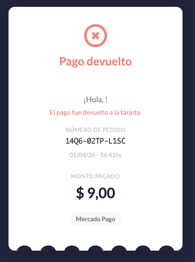 - El estado se actualiza a “Pago devuelto” para vos en el Centro de pedidos, y para tu cliente en la URL de estado del pago.