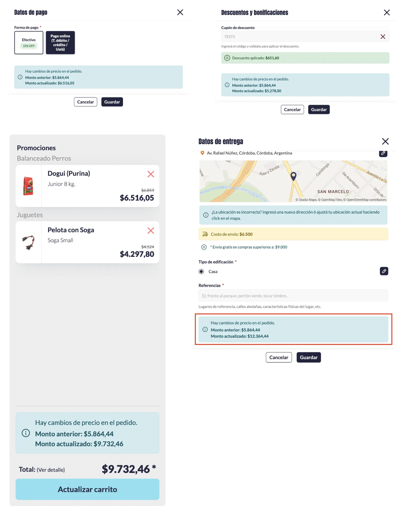 - Al modificar el total, se muestra un aviso con el precio anterior y el nuevo.