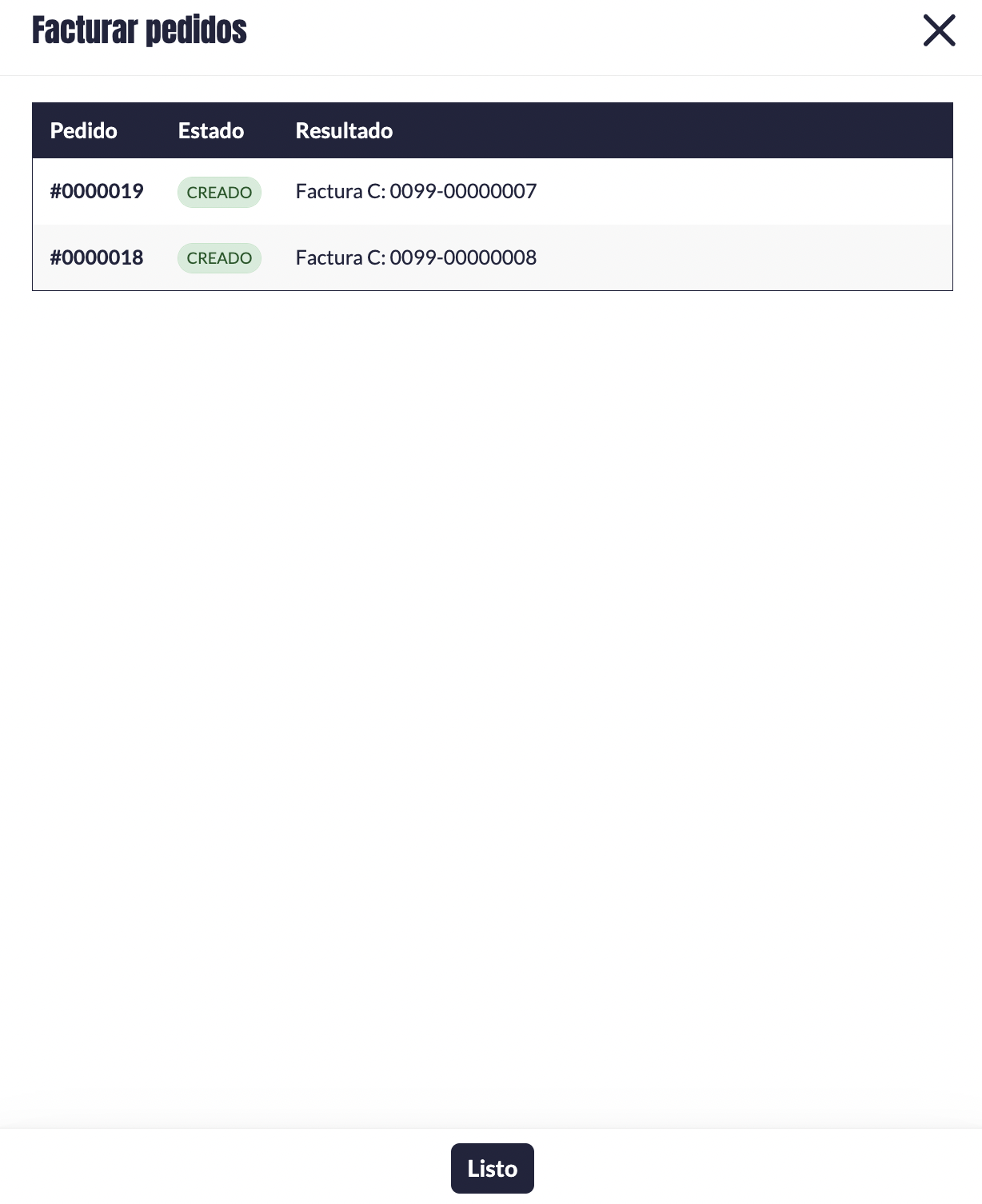 - Si algunos pedidos fallan, se informa el motivo y los comprobantes correctos igualmente se emiten.