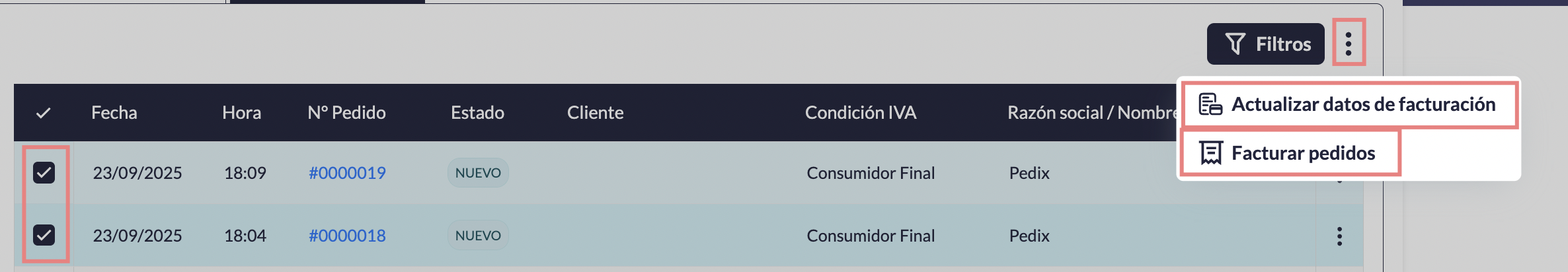 1. Seleccioná los pedidos a facturar y hacé clic en los tres puntitos.