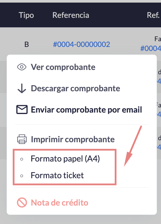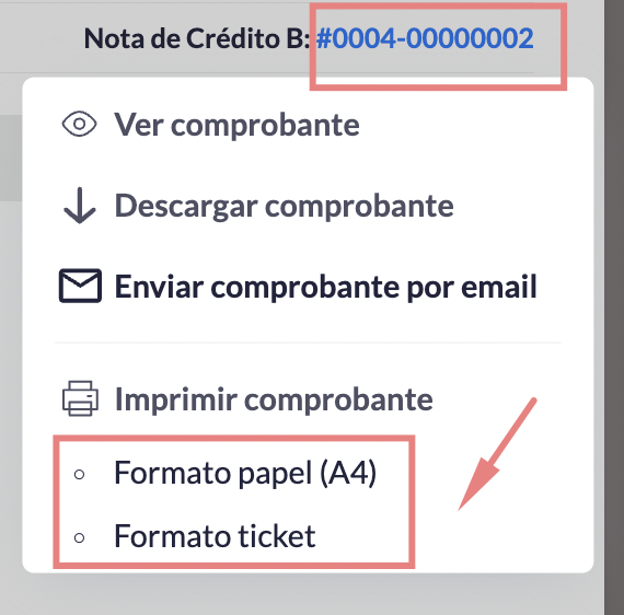 4. Clic en el número de comprobante, se desplegará el menú de acciones y podrás seleccionar A4 o ticket