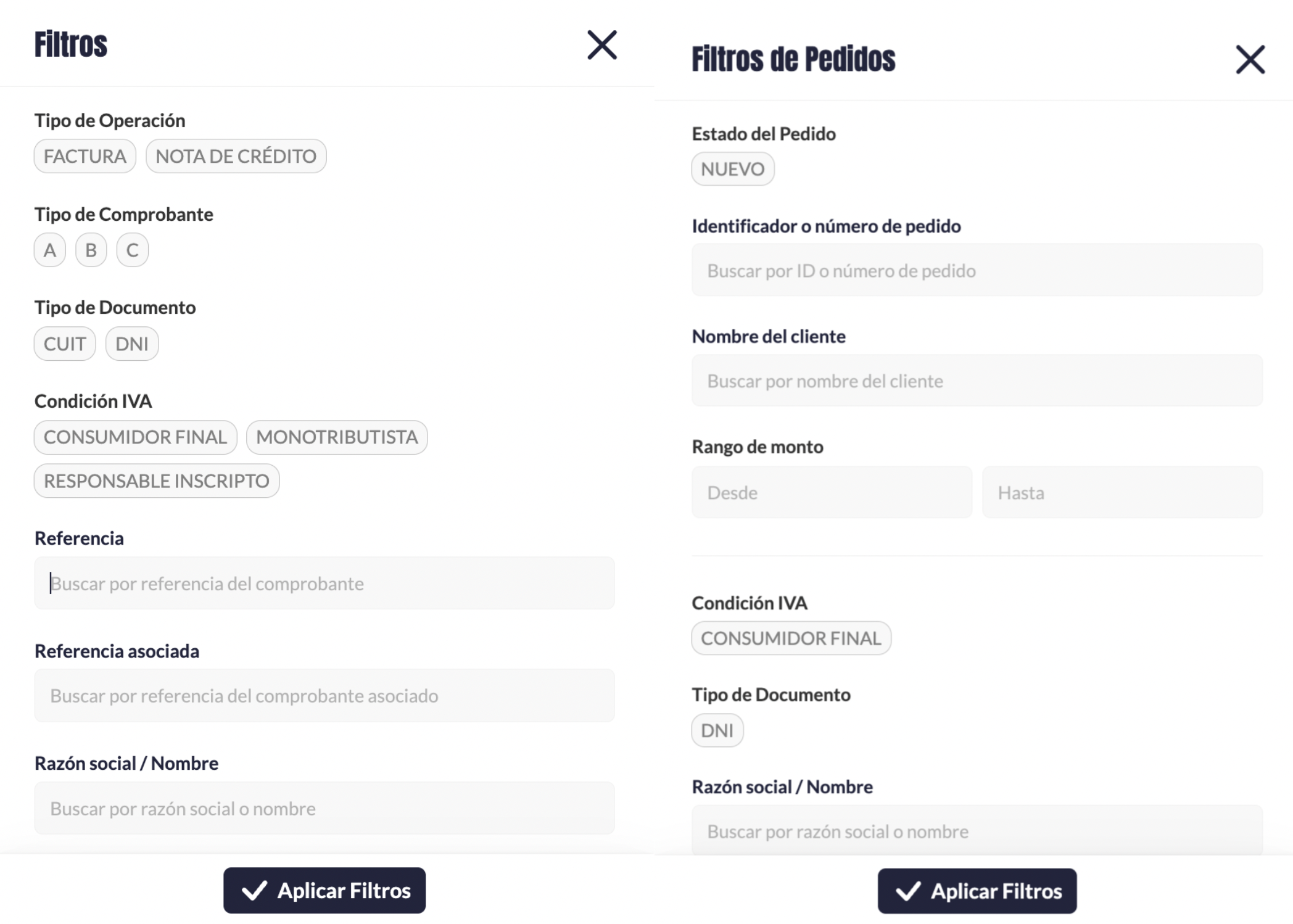 - Podés aplicar filtros para acotar la búsqueda de pedidos o comprobantes.