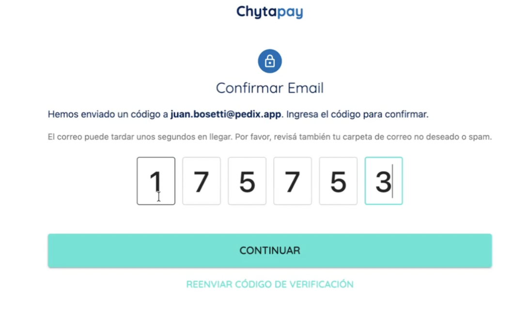 - Copiá el código recibido y pegalo en ChytaPay para validar el correo