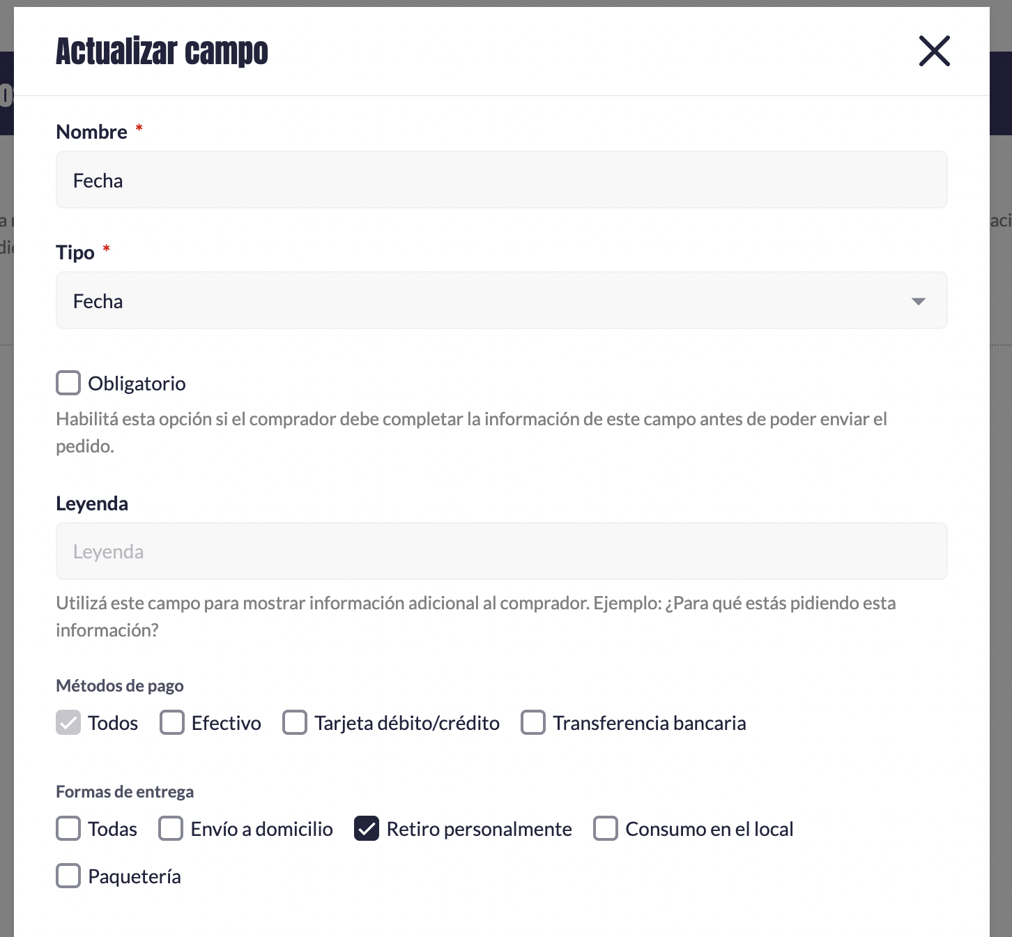 Al crear o editar un campo personalizado, podés definir: