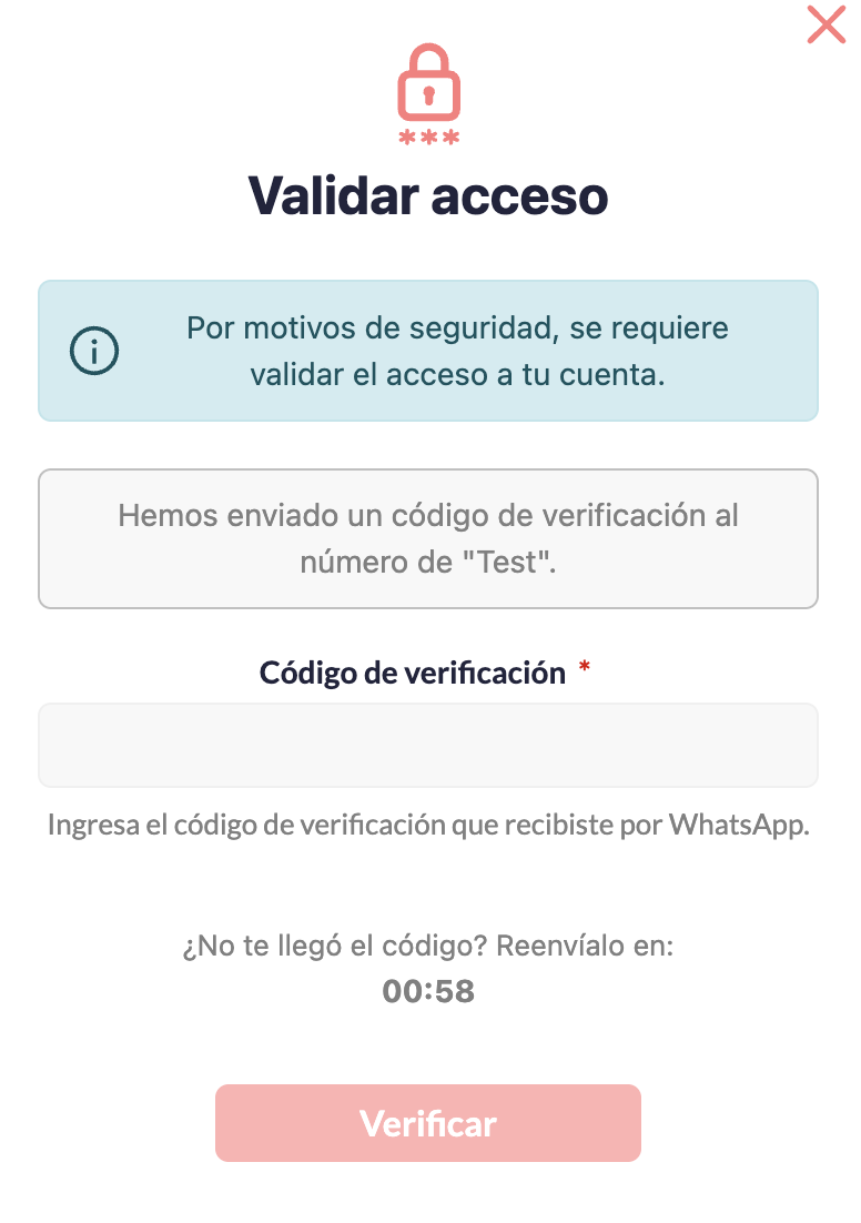 Luego de iniciar sesión, si 2FA está activada, clic a Enviar código para recibir un código de seguridad por WhatsApp.