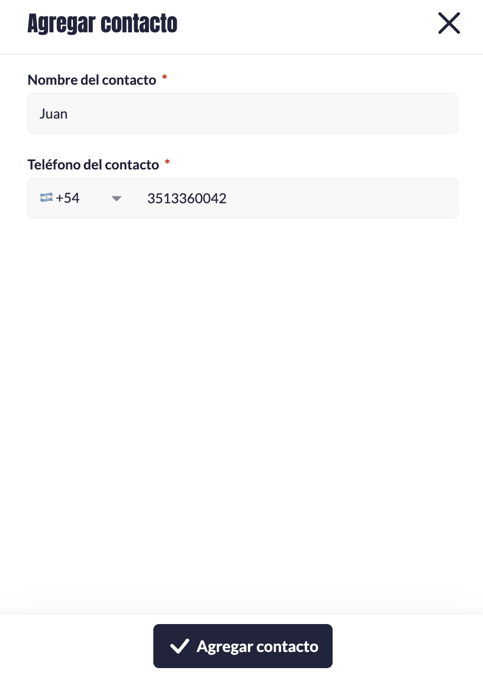 Completa el nombre y el teléfono del contacto y haz clic en Agregar contacto.