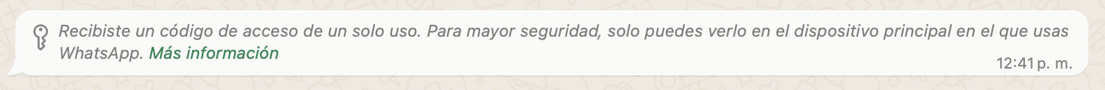 El código solo llega al dispositivo principal (Usualmente un teļéfono, NO llega a WhatsApp Web ni otras plataformas de mensajería).